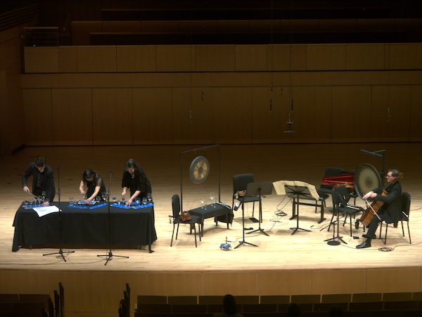 Cellist Jan Müller-Szeraws, as Yoshioka announced before the concert, celebrated becoming a U.S. citizen last month. His elegantly placed high harmonics proved a highlight in the “God-music” movement, accompanied by the other three musicians on bowed crystal glasses filled with water. The limpid major tonality of this accompaniment was one of Crumb’s many uses of consonant harmony to balance the work’s otherwise prevailing discordant violence.