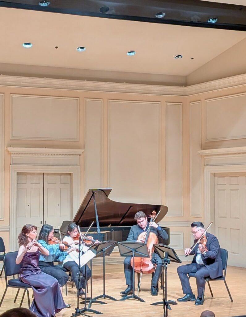 The second movement’s lonely flute melody shone limpidly, accompanied by the delicate pizzicato notes of violinist Juliette Kang, violist Che-Hung Chen, and Cabezas. Although the flute is the obvious star of this affair, the three string players handled their challenging parts in the third movement with alacrity as well. Kang’s cadenza, in parallel lockstep with Stillman, proved a highlight.