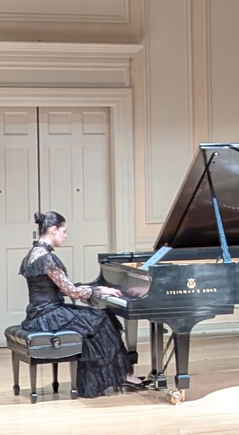 A single bass note in the Library’s magnificent Steinway continued resonating after final chords in the first half. At first seemingly related to Chochieva’s heavy use of the sustaining pedal, it quickly became evident it was a damper malfunction, corrected by a technician at intermission.