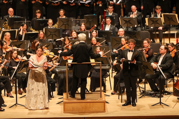 Beginning with just the piano and two solo violins, the piece’s sweet minor-mode tune proved quite pleasing. In response to Wethington’s solo verses, the choir took up the melody with full orchestra providing a sonic backdrop for some very high notes added by the soprano. The texture returned to the opening trio, giving the sense of a voyage coming full circle.