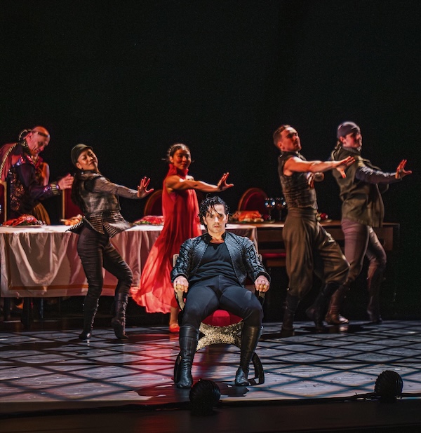 Guillaume Côté, costumed by Michael Gianfrancesco mostly in moody black, made Hamlet seem more inclined to rash action than held back by his own doubts. The most famous of the melancholy Dane’s soliloquies, “To be or not to be,” was alluded to by the momentary placing of his sword to his own throat. Casting Horatio as a diminutive female dancer, the spritely Natasha Poon Woo, gave their interactions a playful quality, as Côté flung Woo about the stage, frequently lifting and carrying her in an agitated fashion.