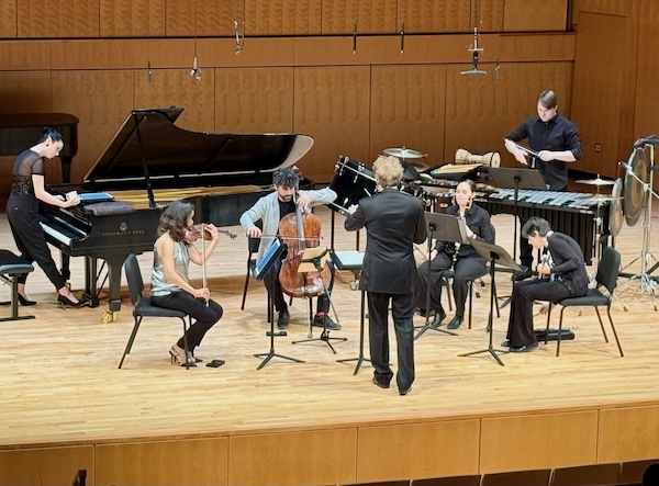 A particularly interesting effect sprang from Cella’s flute and Natalie Groom’s buttery clarinet, blending together seamlessly on a series of solos though they stood about 80 feet apart in the darkness. No less innovative was the sound of small bells, which took a moment to locate: pianist Liana Harron wore them around her left ankle. She also placed one of her son’s wooden story books inside the piano, producing a metallic resonance.